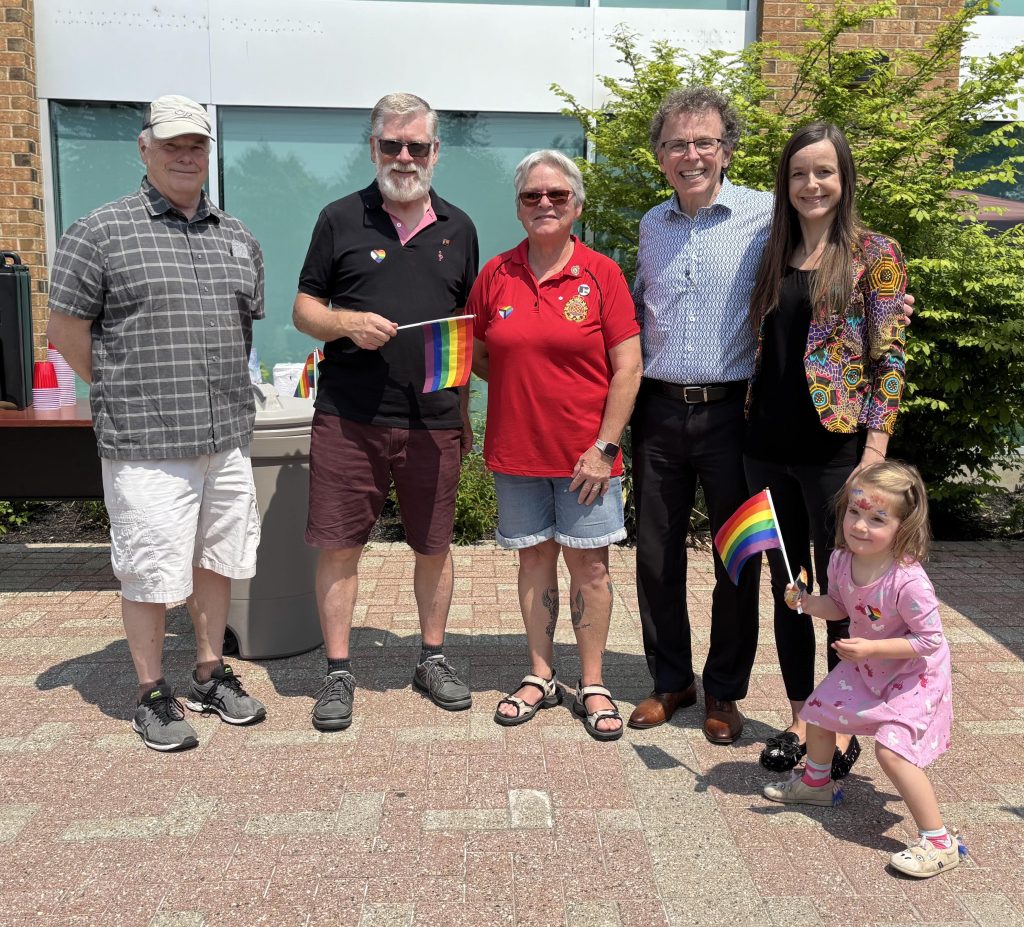 Diane Pitre C.M. (centre) with friends and supporters (including Richard Thain and Geneviève Thain, Russell Township Pride Flag Raising Ceremony co-founders).